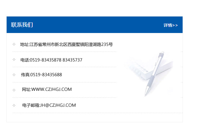 地址:常州市新北區友邦商務大廈1幢16、17層  電話:0519-85101652  傳真:0519-85112595  郵編:213022  網址:www.cz-jiayue_cn.yiyu91.com  郵箱:xiajifengaa@163.com